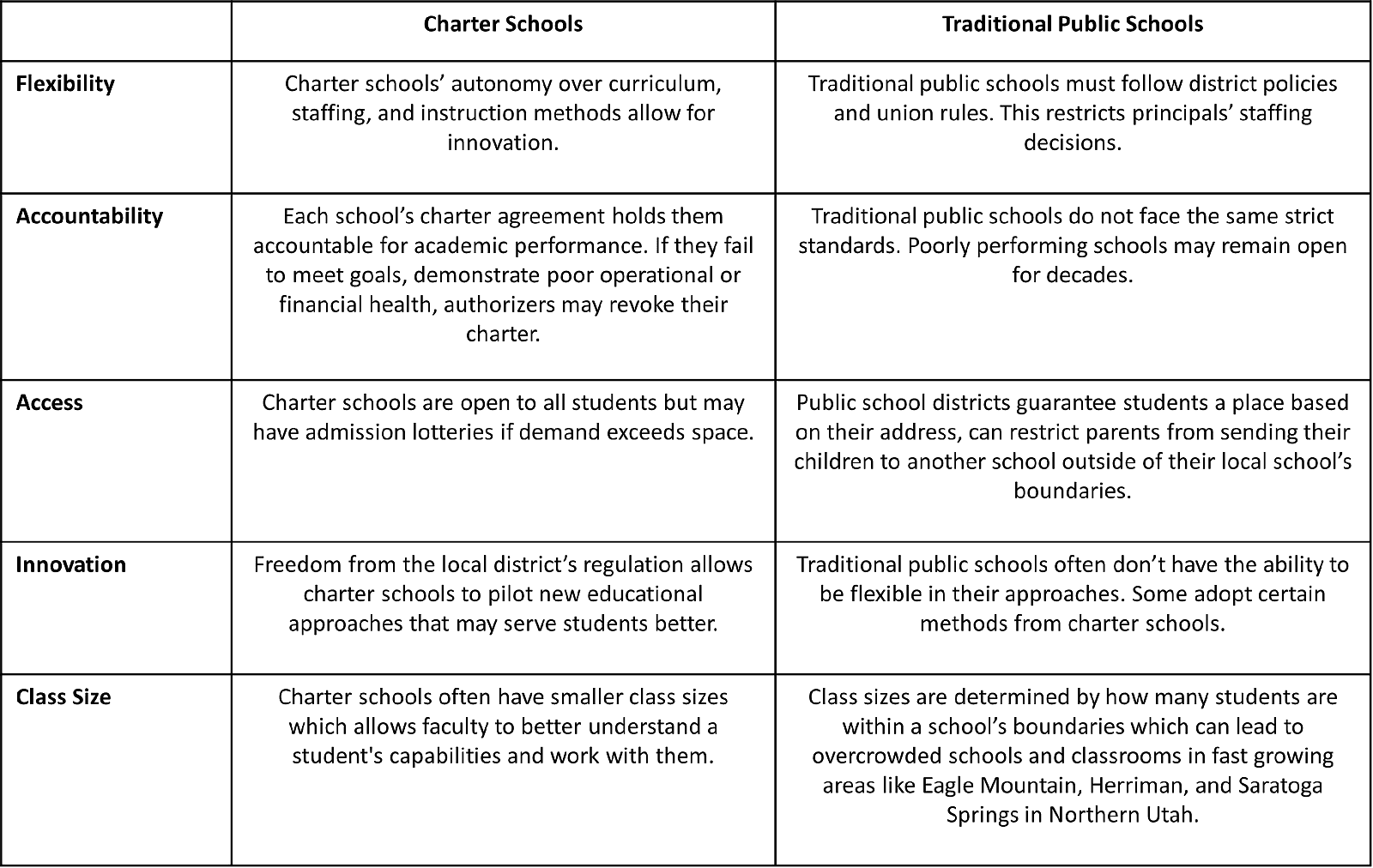 In Utah, public charter schools receive about a third less public funding than traditional public schools. For example, charter schools do not receive student transportation funding like public schools.